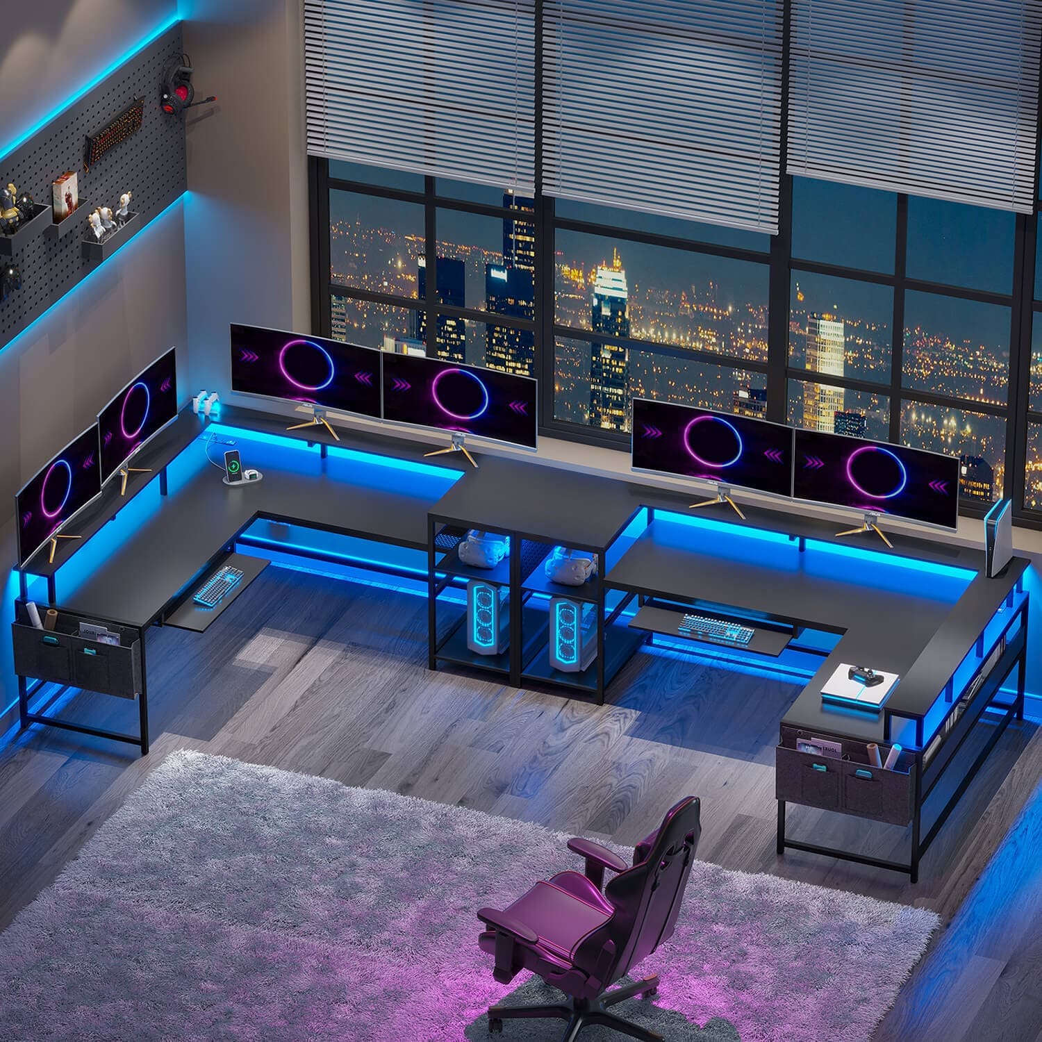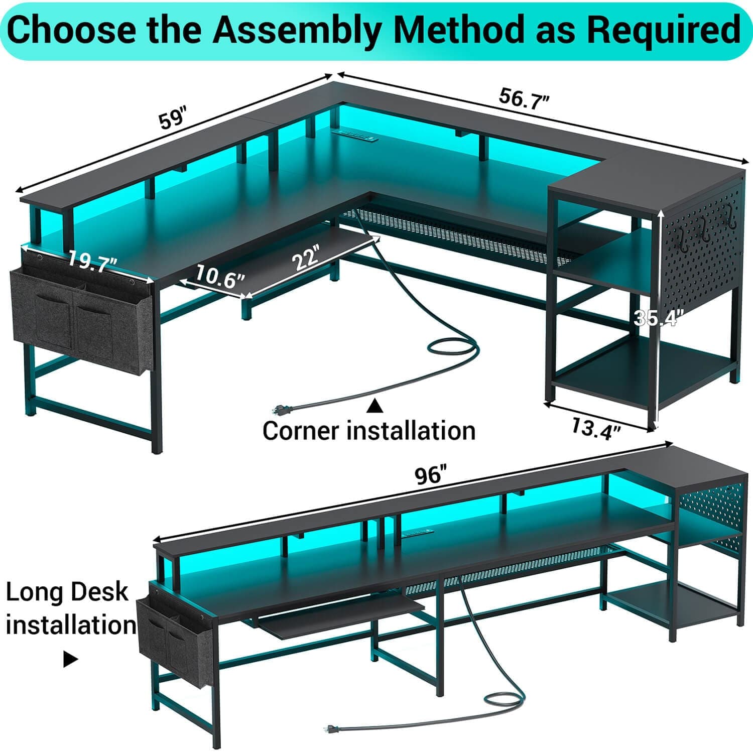 96 Inches L Shaped Reversible LED Gaming Desk Black